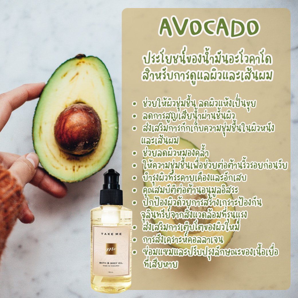 เนื่องจากกรดโอเลอิกในปริมาณสูงน้ำมันอะโวคาโดจึงเป็น ‘น้ำมันตัวพา’ ที่รู้จักกันดี ซึ่งหมายความว่าคุณสามารถผสมน้ำมันอะโวคาโดกับน้ำมันหอมระเหยอื่น ๆ เพื่อให้สารอาหารจากน้ำมันเหล่านั้นสามารถส่งไปยังผิวหนังและดูดซึมได้อย่างมีประสิทธิภาพมากขึ้น